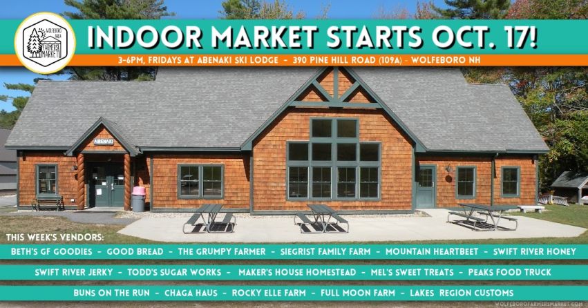 The Indoor Market kicks off Friday, October 17 from 3–6 PM at the Abenaki Ski Lodge in Wolfeboro! 🥕🍞🍯